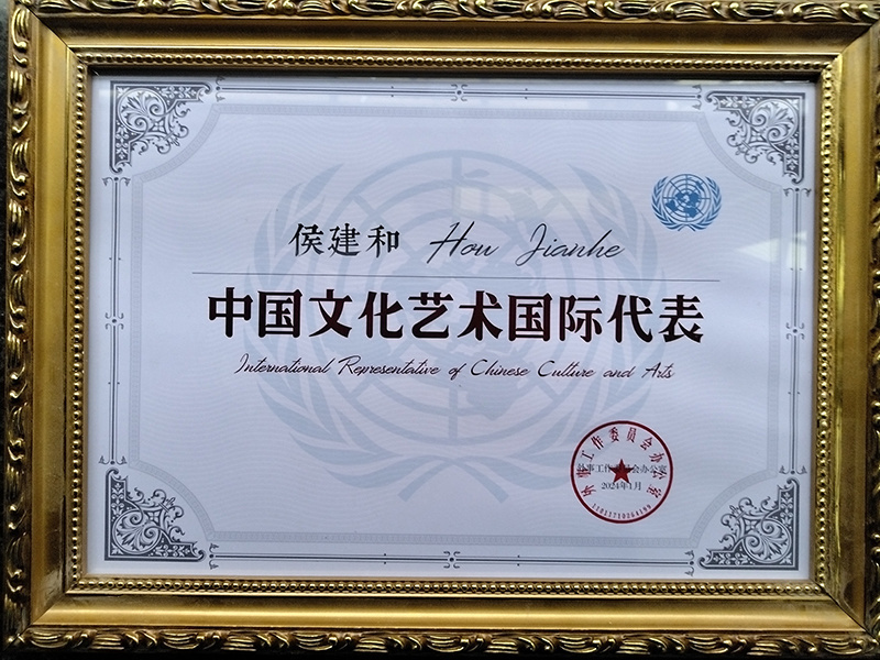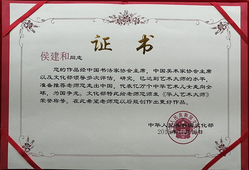 侯建和,笔名山人,1952年6月出生,江苏灌南人。自幼爱好书法艺术,多年来为传承弘杨中华传统文化鼓与呼。2020年国务院颁发《人民艺术家》证书。兼任国家文旅部名誉顾问;外事工作委员会办公室大国外交文艺使者、中国文化艺术国际代表;国台海峡论坛文化顾问;中国乡土艺术协会顾问;中国国际艺术馆名誉馆长;中国国际文艺家协会常务理事;央广文旅国际合作发展中心副理事长;中国艺术研究院国家文化发展战略高级研究员;cctv书画频道、华夏之声、香港电视台特邀艺术家;cctv高清综艺娱乐频道、cctv我要上央视、全球青少年书画艺术大会书画导师;晓云(北京)工作室中央级专家等。1998年参加“98韩国世界美术大展”、2018年参加纽约时代广场“中国艺术大家形象展播工程”、2019年参加中法建交55周年“巴黎卢浮宫艺术展”、2019年获人民日报“全国重点推荐艺术名家”,并在互联网宣传报道等。1999年中国文联授予“海峡两岸德艺双馨艺术家称号”;2015年国家文化部授予“中国当代书画艺术名家”称号;并颁发《华人艺术大师》证书;2020年国务院授予“人民艺术家”证书;2021年央媒联盟授予“全国十佳杰出功勋艺术家”证书。2022年入选央视重点推荐新时代艺术领袖网络宣传活动,并入编央视《新时代人民艺术家典藏》;2022年入编国际航空运输协会《中国之声》世航专刊、入编国务院新闻办公室编辑出版的“中国艺术白皮书《侯建和篇》”、入编《中国艺术国际贸易指南》大典并荣获“国家重点推荐——走进世界艺术舞台的国艺巨匠”证书;2022年中共二十大传统文化组委会、人民日报社、中美协、中书协等授予“艺术界时代楷模”证书;2023年国际文化艺术交流高峰论坛组委会颁发《中外文化交流杰出人物》证书;入编国家《复兴文库(人艺篇)》;入编国家首部爱国主义教育学刊《中国红》;2023年国家外事工作委员会办公室授予“大国外交文艺使者”;入编由东盟文化信息委员会等及十余个国家参与编辑的《大美之艺》画册并授予“东盟文化艺术交流大使”;全国突出贡献专家;2024年国际奥委会授予“东方艺术大师”称号等。