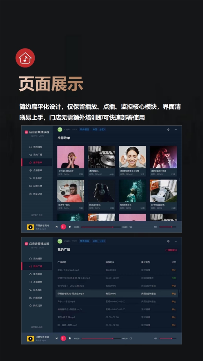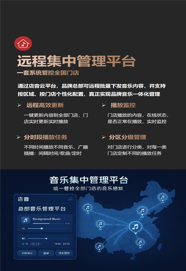 店音播放器软件,一款可安装在电脑、平板或手机端的专业播放器,助力连锁品牌实现总部统一策划、门店自动执行、全程在线监控的背景音乐管理