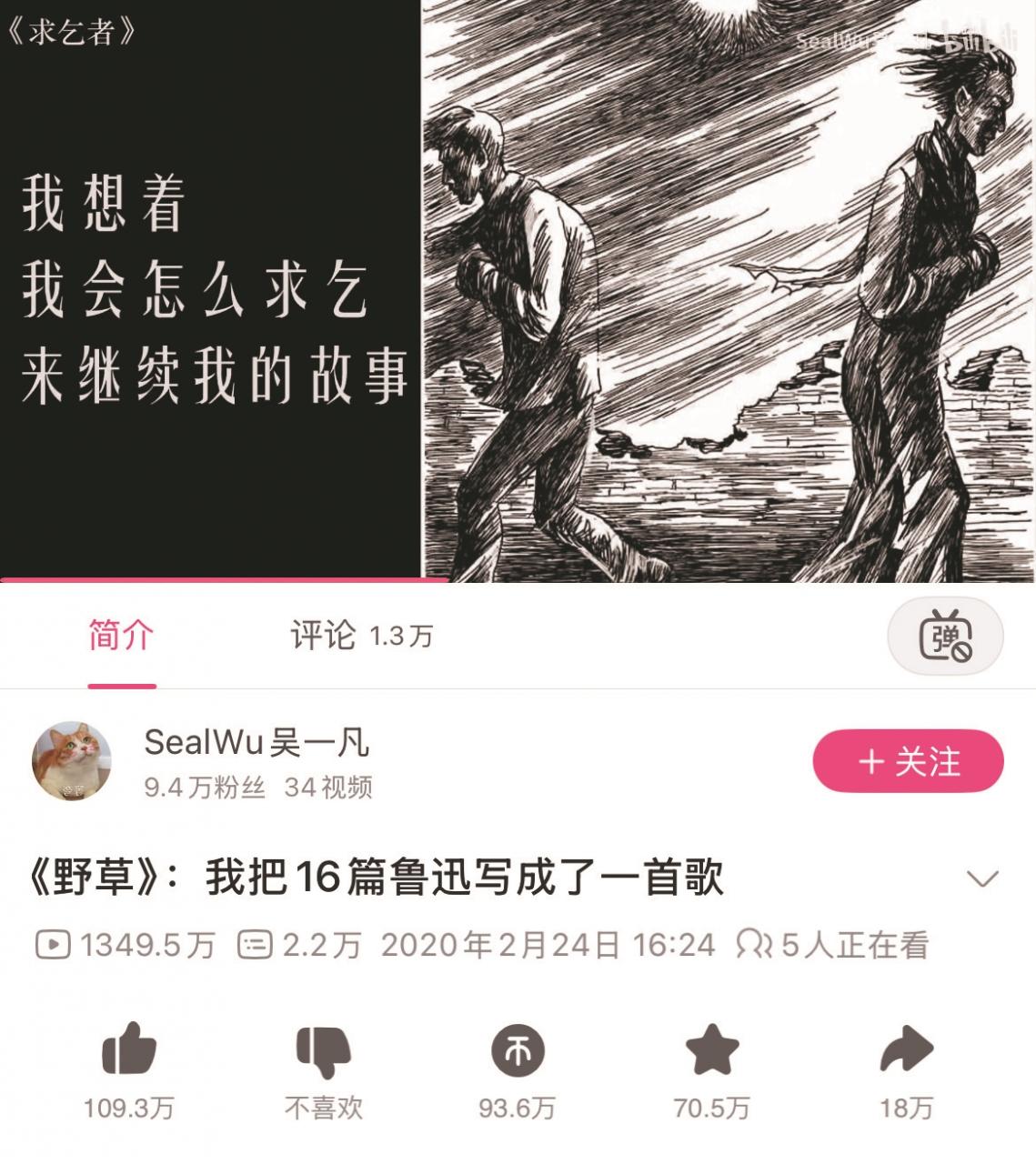 近些年,鲁迅的文创周边和经典语录受到众多年轻人的追捧,甚至由此衍生出了“鲁迅说”等“梗”文化。鲁迅金句频频被改编并制作成书签等文创产品,令不少读者热衷。有关鲁迅的“二次创作”也层出不穷,较为典型的是有位哔哩哔哩博主将《野草》改编成一首说唱歌曲,他选取书里的16篇散文诗的主要意象,以押韵形式连缀成一首歌,配以鲜明的节奏,获得1340余万次的浏览量。由此可以看出,数字时代的年轻人通过新媒介不断重新阅读、理解鲁迅,创造着自己心目中的鲁迅。人们试图还原与重塑数字时代的鲁迅,从他对于生命、社会、历史等命题的深刻思考和所创作的意蕴丰富的文学作品中,探寻他的思想与美学追求对于当下的启迪,将当下社会生活与艺术文化的特质附加到互联网里的鲁迅形象中,赋予了鲁迅精神当代性。鲁迅从历史与书本里走了出来,走入了当下年轻人的文化生活中。