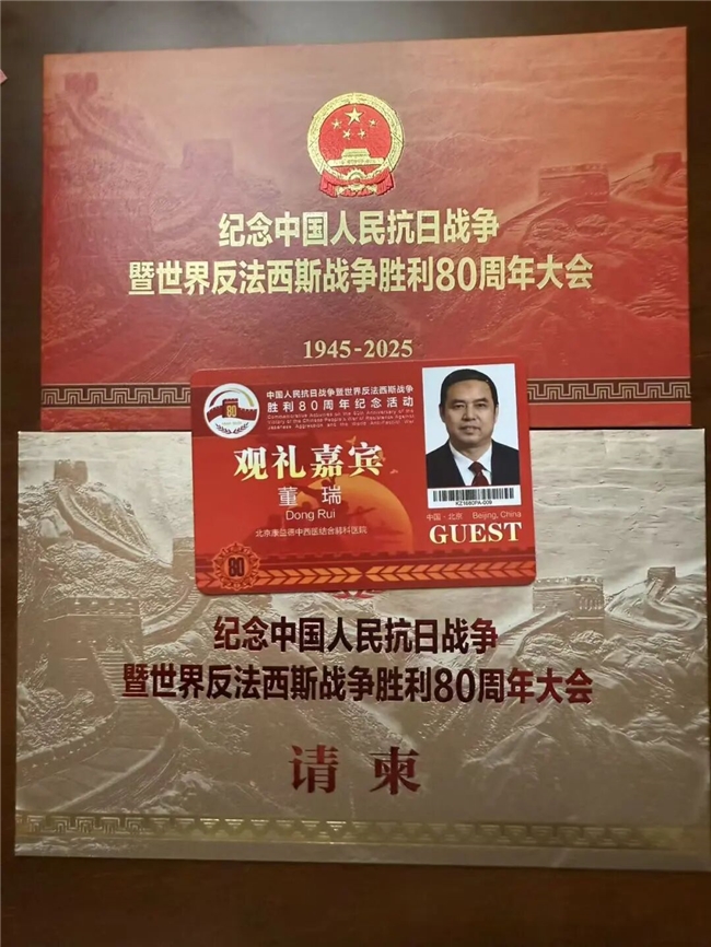 2025年9月3日,在庄严的天安门广场,中国人民抗日战争暨世界反法西斯战争胜利80周年纪念日阅兵仪式隆重举行。十三届全国政协委员、民盟中常委、首都名中医、享受国务院特殊津贴专家、中医主任医师、博士生导师、世界中医药学会联合会中医膏方专业委员会创始会长、经典名方现代中药创制全国重点实验室“肺结节与肺癌”防治研究中心主任、北京康益德中西医结合肺科医院创始人董瑞成为主观礼台阅兵嘉宾。