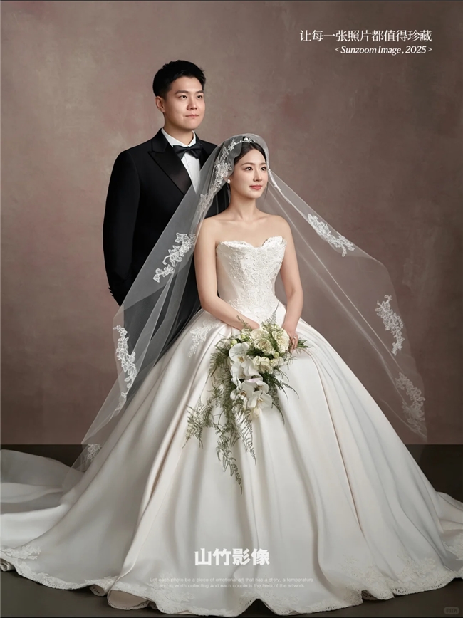 山竹影像的中式婚照高端且具氛围感,作为珍藏级影像品牌,中式场景打造极具匠心。上万平米影像艺术中心的中式影棚,复刻传统中式建筑的精髓,红墙、雕花、屏风、宫灯等元素一应俱全,高级感十足。高定礼服馆陈列着设计师款中式婚纱和联名款秀禾服,面料奢华、工艺精湛,男士西服款式丰富且适配中式风格。拍摄风格涵盖中式电影感、法式中式混搭、复古油画中式等,原片质量高,后期修图融入中式色调,让成片氛围感拉满,古韵与高级感兼具。