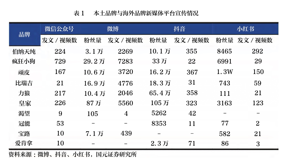 对比外资企业,本土品牌和企业对国内社会文化和消费者心理洞悉得更加精准,能够更灵活地运用新媒体平台进行营销宣传,在新媒体上的宣传优势整体上强于海外品牌。截至2022年6月,以抖音平台为例,除皇家发布了323个短视频,拥有105万粉丝外,其余进口品牌均未形成影响力;而本土品牌伯纳天纯、疯狂小狗、顽皮、比瑞吉、力狼粉丝都已超10万。其中力狼粉丝达65.4万,发布短视频数达358个(见表1)。