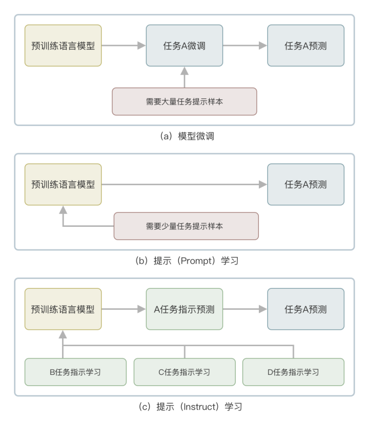 因为对于人类用户,最好的方式就是语言模型可以直接理解我们对它的“指令”或者“示例”,根据指令去调用相应的自然语言处理下游任务。于是GPT选择了从“微调”到“提示学习(Prompt Learning)”,再到“指示学习(Instruct Learning)”的技术路径,一步一步降低了用户使用门槛,把“通用语言模型”调整到适配正常人类的习惯,这样才在现在获得巨大成功。
