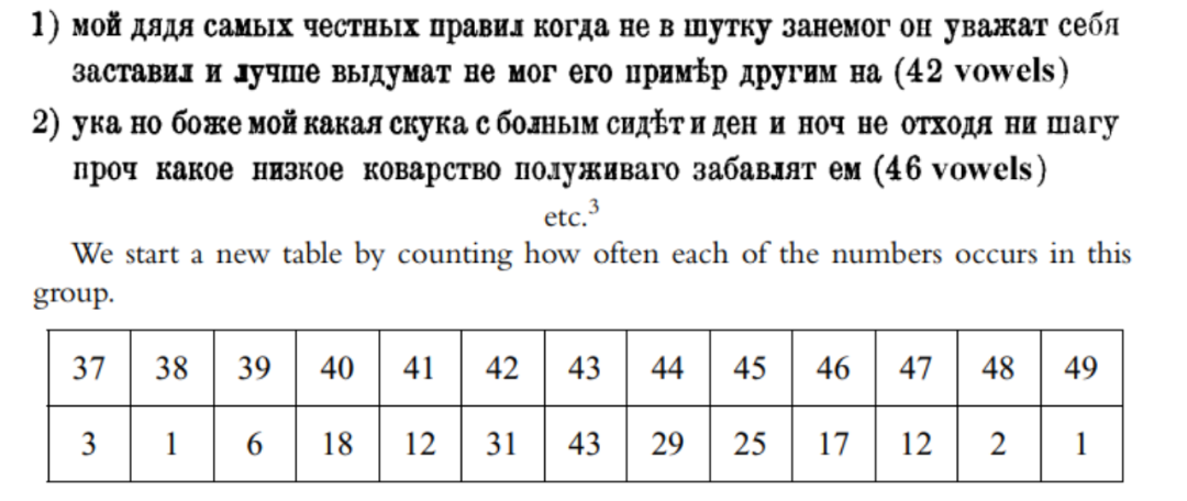 马尔科夫发现,虽然这长串字母中有43%的元音,57%的辅音,但是元音与辅音之间的连接却截然不同,元音-元音、辅音-辅音、元音-辅音/辅音-元音连接分别出现了1104、3827和15069次。这意味着若随机抽取书中任何一个字母,如果结果是元音,那么下一个字母大概率是辅音,反之亦然。《尤金·奥涅金》的字母之间显然存在着某种可以被数学建模的统计特性。