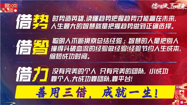 人生三借,成就伟业,所谓三借,第一借势,成就一个事业,就要学会借势,时势造英雄,雷军讲站在风口上面,猪都能飞起来;第二借智,把别人走过的弯路,实践出来的经验教训,形成知识拿过来,就可以少走很多弯路;第三借力,一个人想成就伟大的事业很难,但是一批人,一个平台,一个组织,信良记就是一个平台,就是一个组织,帮助大家成就一番事业,所以这就是三借。