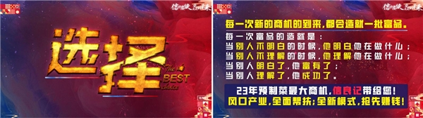 选择是不是有保障?选择信良记六大保障。第一、品牌支持和核心产品支持,四梁八柱,做信良记,小龙虾产品是第一大支持,省代一年做小龙虾一个省最多3000-4000万,少的也有2000多万。第二、预制菜第一品牌,我们致力于打造作为预制菜的第一品牌,现已跻身预制菜第一梯队,真正的预制菜在我看来第一必须要熟制,第二复合入味,第三简单加热还原,真正具备这三点才是真正意义上的预制菜,所以信良记小龙虾真正意义上具备这三点。信良记在16年就提出过预制菜的概念,应用到小龙虾产品上,把小龙虾产品形态作为预制菜产品形态的一个开创者和鼻祖。第三、前期对省代和体验店的前期保护机制,一省一代,一县一店,专属的产品线,渠道保护策略,全国冷链物流网络支持,整合了全国的冷链百强企业里几十家给我们做服务。同时一对一的代渠道拓展赋能,一对一开店和运营赋能,手把手帮扶,所以选择有没有保障,在这六大保障做支持的基础之上,我们要守正出奇,通权达变。守正笃实,久久为功,这就是选择信良记最大的保障。
