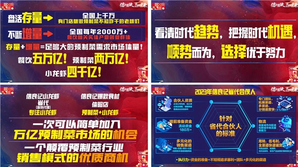 再从另外一个维度看,第一,盘活存量,从17年加入信良记到今天,我总结了全国有上千万有门店想做预制菜不知道咋干的老板,上千万群体都看好了预制菜这门生意,我有店、有人、有钱、有想法,巨大的市场。第二,不断的增量,全国每年有两千万家餐饮相关实体产业的创业群体,尤其是过了疫情,增量加存量,巨大的预制菜需求市场体量,只有这个市场足够大,才能从这个市场里面分到足够大的蛋糕,同时又契合国内主旋律,所以在选择上看清时代趋势,把握时代机遇,顺势而为,选择大于努力,从第一个分享判断,行业是不是一个正确选择,我觉得做预制菜小龙虾这个产业是正确选择;第二,我们看一下模式是不是能够赚钱,行业我们选的都对,模式到底能不能赚钱,总结一下我们两大模式,一是信良记省代,包括海外的代理,今年仅释放两到三个的国家代理,专注小龙虾产品,信良记爆款食材体验店这个项目是预制菜加小龙虾,省代合伙人,我们叫省代合伙人六边形战士,作为省代合伙人,需要有这6方面的能力,六边形的能力可能有两三个缺失没关系,我们的团队可以帮助你补足,只要有资金别的能力都可以帮你补足,有资金、有愿力、有想法,这个是基础。