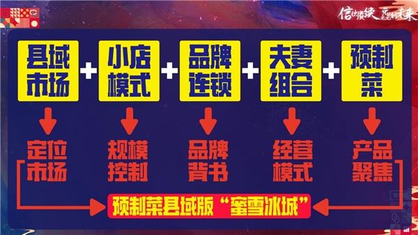 我们爆款食材体验店的定位,为什么要定位县域市场?其实刚才王会长、于秘都做了深刻的分析,第一定位县域市场,第二小店模式,我们的爆款食材体验店不需要把规模做得很大,同时信良记做品牌背书,经营模式可以夫妻店、老婆店的模式为基础,最大化优化成本,提高人员效率,最后产品聚焦就做预制产品,所以由5个方面奠定了我们是预制菜县域版的蜜雪冰城。
