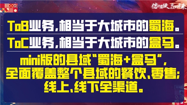 信良记爆款食材体验店的一些功能区和设计图,仅仅是一个月的时间现在全国已经落地近二十几家,发展速度非常快,模式大家非常认可,那爆款食材体验店除了县域的定位还怎么定位?第一相当于大城市里的蜀海,爆款食材体验店虽开在县域市场,但是tob业务相当于大城市里蜀海,蜀海是给海底捞做食材供应的。第二爆款食材体验店在县域里,我们的零售端相当于大城市里的盒马,盒马是店、仓结合的新零售模式,所以爆款食材体验店就是一个mini版的县域蜀海加盒马,全面覆盖整个县域的餐饮零售线上线下全渠道模式,这就是爆款食材体验店模式的创新性,打造一个具备创新性的综合体,这个模式契合县域市场的消费升级,实现我们县域的蜀海模式,实现县域餐饮的食材供应。
