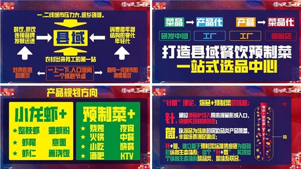 我们很多县域市场的餐饮门店,餐饮微连锁,很少有人会把他们服务的特别好,在食材供应这块我们爆款食材体验店就解决这个问题,同时又实现了县域的一个即时配送,当时邸会长给我们一个建议,县域的盒马实现整个县域市场,30分钟全部搞定县域市场的即时配送,通过预制菜的产品形态,将一线城市国家级烹饪大师的厨艺和味道输送到县域市场,在县域市场里不可能有国家级的烹饪大师,然后通过预制菜的产品形态,将味道、品质和做菜的工艺,输送到县域市场,让我们县域市场的千家万户的消费者和千家万户的餐饮终端,能够享受到一线城市的大师级的厨艺和美味,所以这是预制菜一个核心。定位县级市场,除了国家政策导向、县域市场消费升级,还有一个核心点,一二线城市的工作压力大,很多年轻人都返乡创业,但返乡不会返到农村,返到县域市场,农村出来务工,第一站选择在县域市场,所以从人口流动来看,县域就是第一个最重要的核心节点。我们再看县域消费者的年龄结构已经发生重要的变化,他们现在已经趋向于一线城市的消费,从县域市场餐饮的开店,包括一些茶饮开店的数量,可以看到县域市场的年轻消费群体已经开始崛起,同时他们消费结构的变化导致这些品牌快速崛起,产生了大量对预制菜和标准化食材的需求,所以我们爆款食材体验店项目应运而生,包括整个省代全渠道模式发展的一个重要基础。结合这些需求,我们爆款食材体验店在县域市场将会打造成为县域餐饮预制菜一站式选品中心,由研发中心、工厂把我们的产品做成预制菜,再通过我们的体验店,前端是菜品产品化,后端是产品菜品化,所以成为我们爆款食材体验店,就成为了县域里的一站式的预制菜食品中心,同时具备一线城市的国家级烹饪大师的味道和工艺的产品。作为产品选品中心,信良记的产品规划在产品研发上以场景为导向,契合现在发展速度最快的方向和趋势,给大家提供全系列的最优质产品。在产品研发上还有一个理论叫针筒理论,首先小龙虾就是一根针,小龙虾这个针扎下去,将我们所有的客户产生链接,真正意义上在这几年了解信良记,认识信良记,应该都是因为小龙虾这个产品结缘。我们现在重点是在做预制菜,预制菜就是一个桶在针的周边再套上一个桶,围绕着相关产品的一些场景,不断的研发更多的产品系列来丰富这个场景,这就是在产品上的开发逻辑,我们会插很多个针,包很多个桶,最终形成多个纵向生态体系的跨品类,跨体系的联合,这就是爆款加预制菜产品研发的底层逻辑。